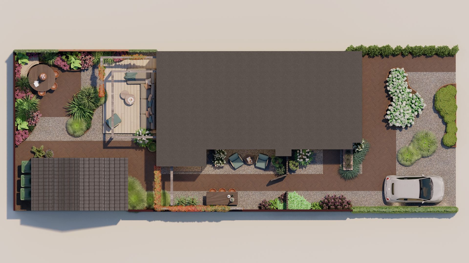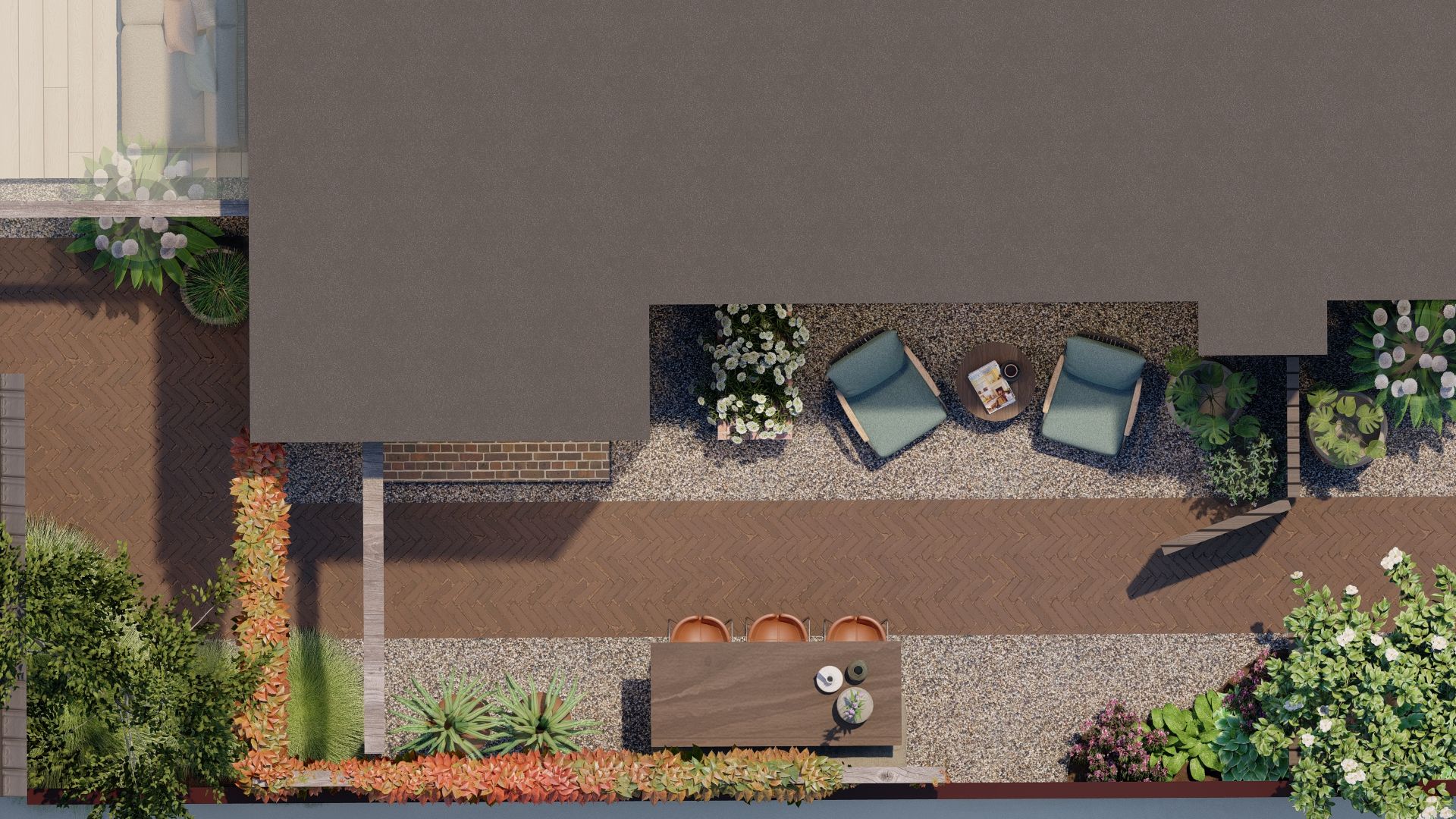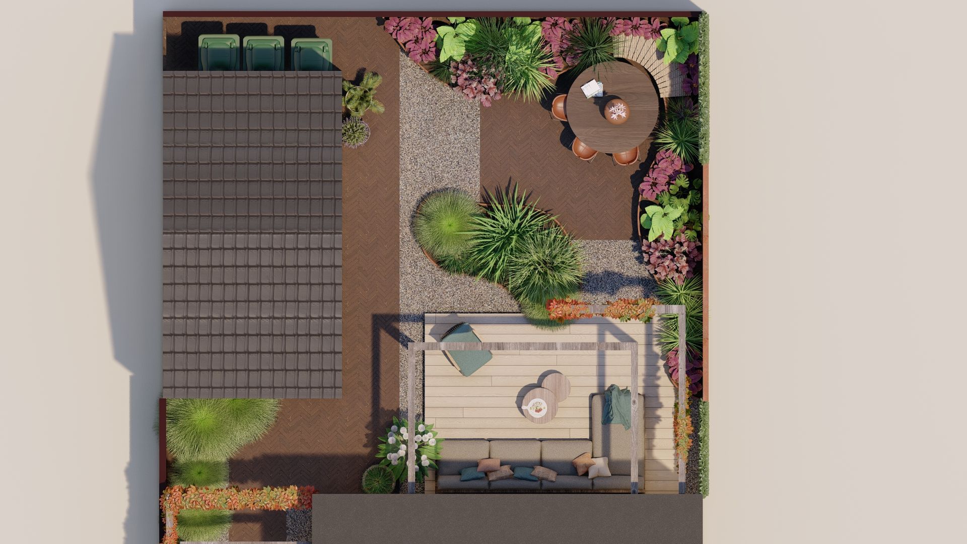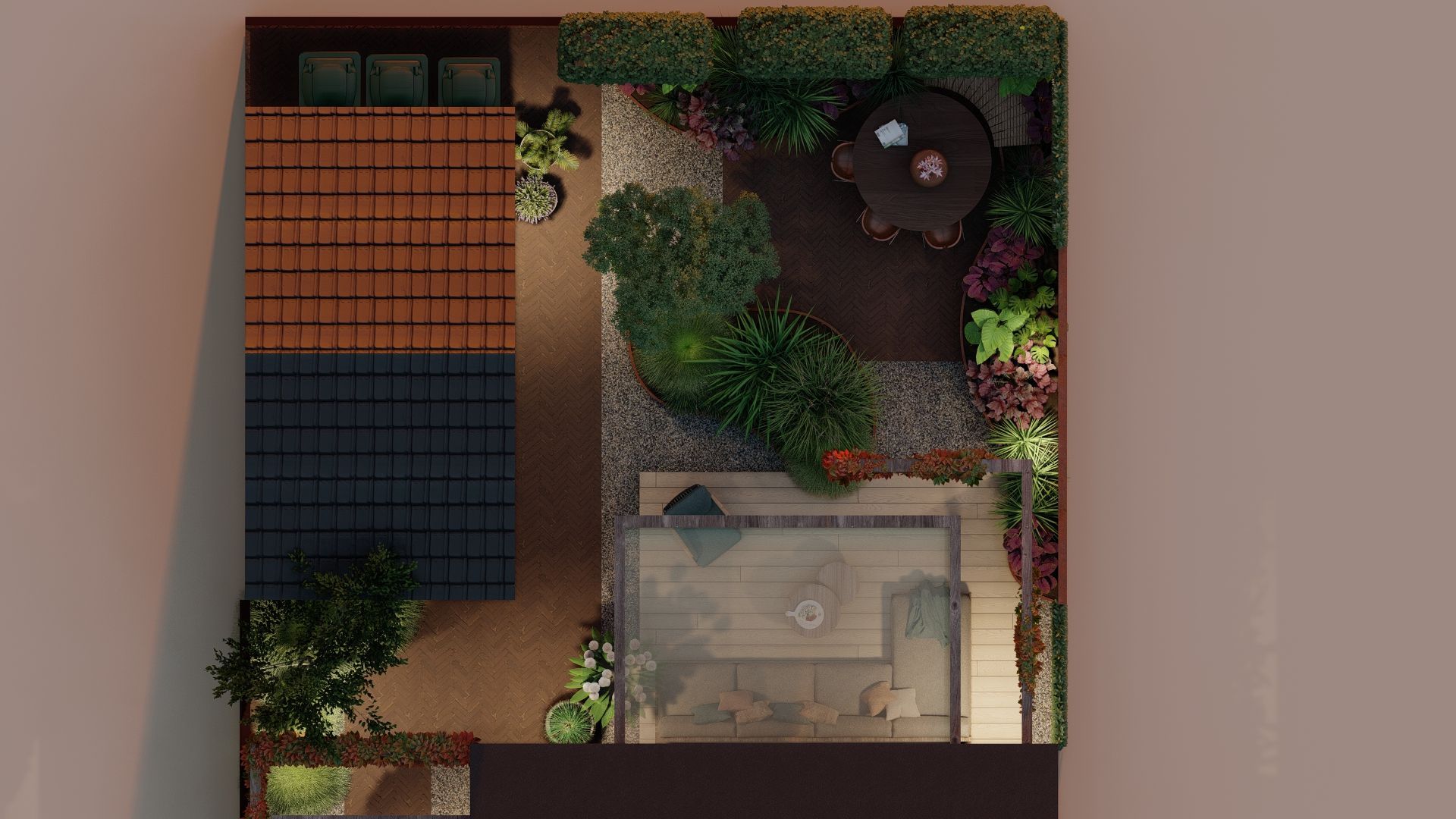 Een dertige jaren woning vraagt een om tuin die naadloos aansluit bij de stijl van het huis. In dit ontwerp is gekozen voor rechte lijnen voor de verharding, afgewisseld met organische vormen voor de verhoogde plantvakken van CortenStaal. De rood-bruine waaltjes passen perfect bij de kleur van het huis. De combinatie met het grind en de lichte houten vlonder brengt de juiste balans in deze tuin. Onder de pergola met zonnedoek kan ook op de hele warme dagen genoten worden van verkoelende schaduw. De Leibomen achterin de tuin zorgen dat de tuin heerlijk uit het zicht gehaald wordt van tegenoverliggende woningen. Aan de zijkant is genoeg ruimte voor een heerlijk zitje in de ochtendzon. En met de pergola voor de schuur komt het geheel prachtig samen!
