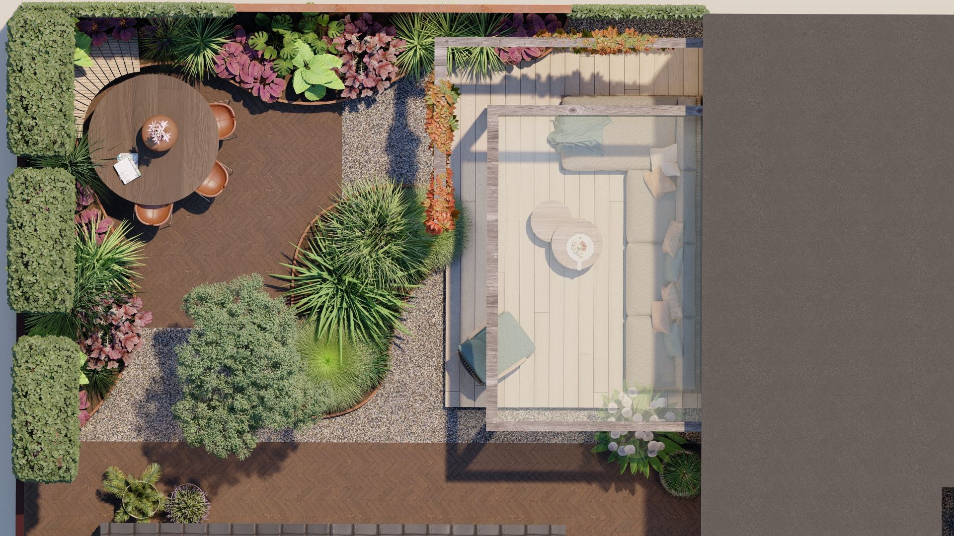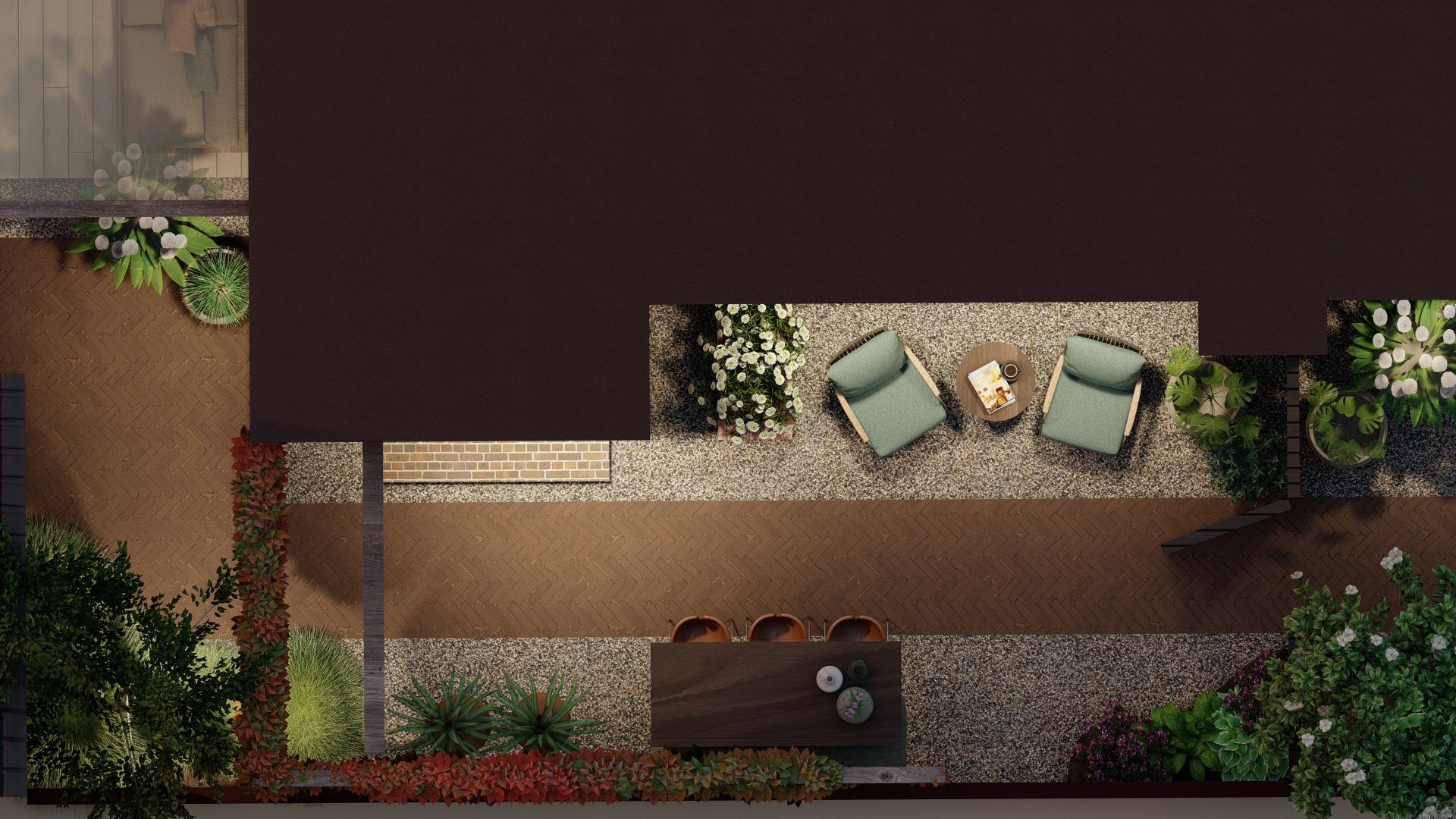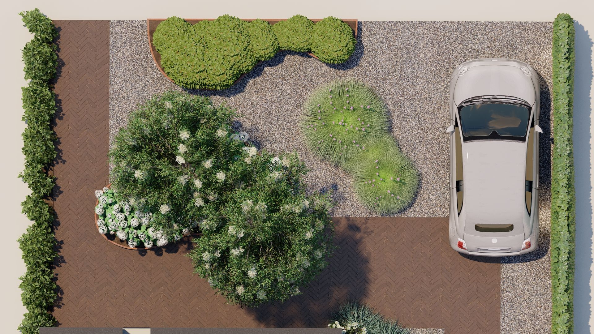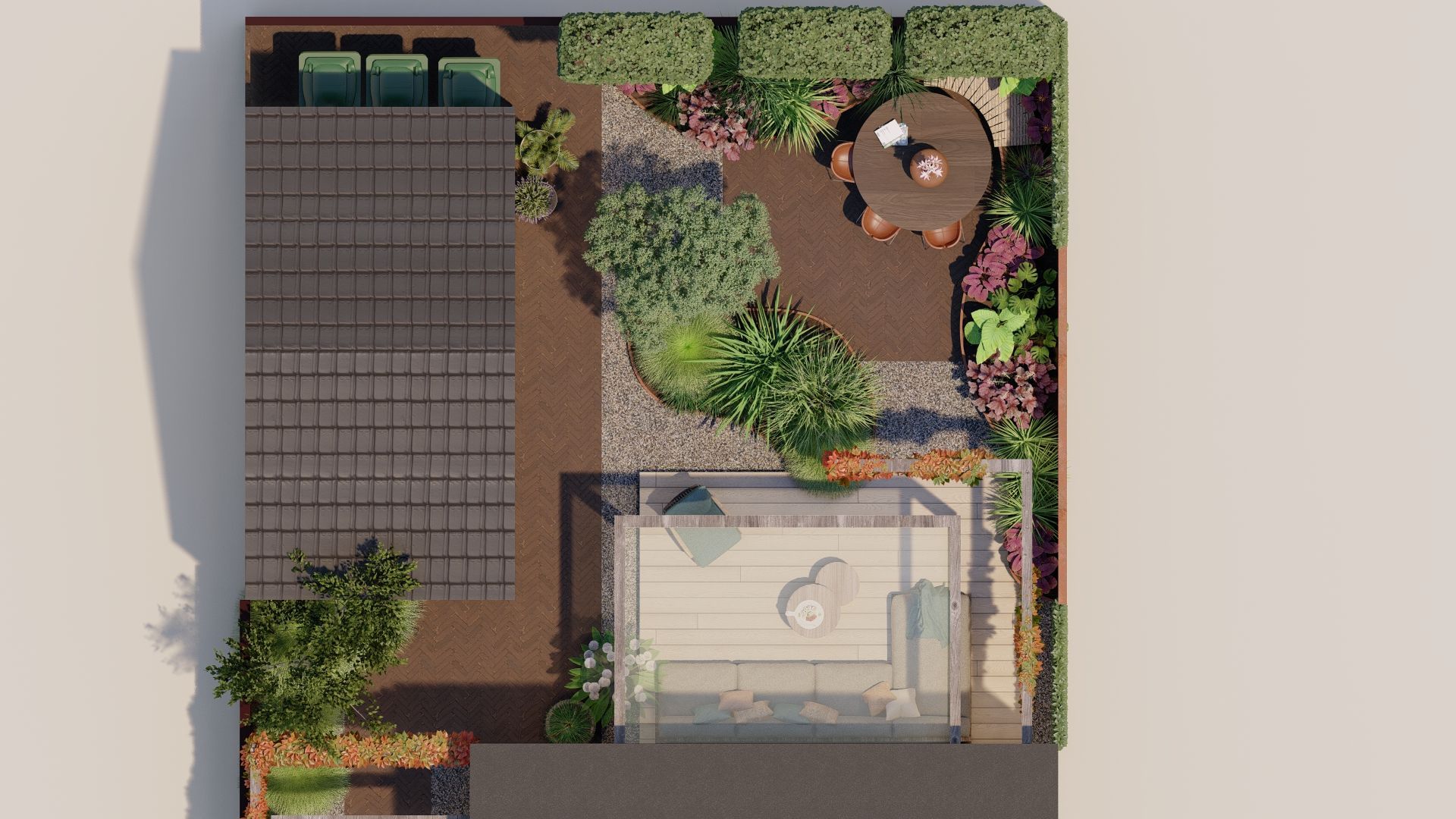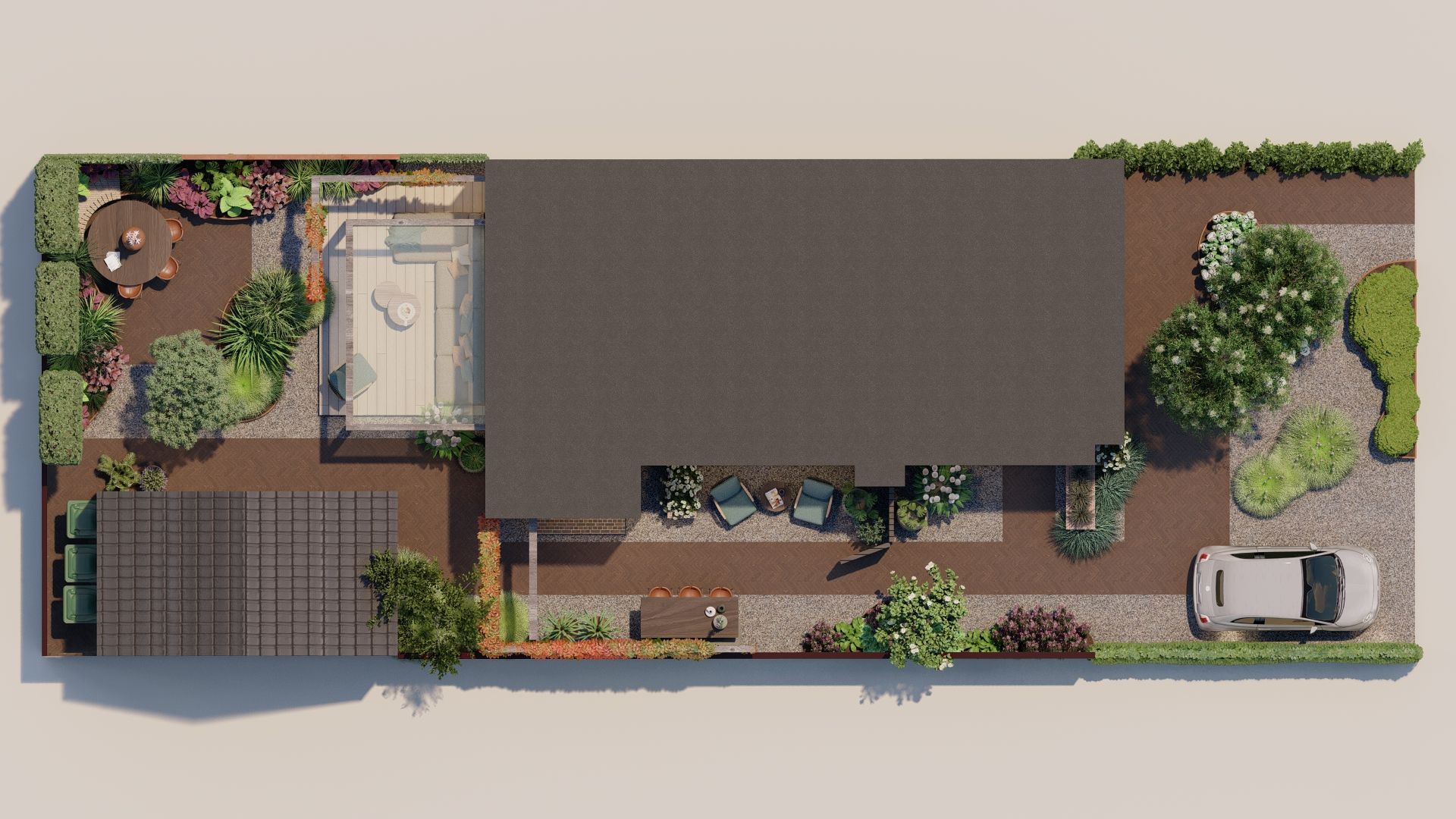 Een dertige jaren woning vraagt een om tuin die naadloos aansluit bij de stijl van het huis. In dit ontwerp is gekozen voor rechte lijnen voor de verharding, afgewisseld met organische vormen voor de verhoogde plantvakken van CortenStaal. De rood-bruine waaltjes passen perfect bij de kleur van het huis. De combinatie met het grind en de lichte houten vlonder brengt de juiste balans in deze tuin. Onder de pergola met zonnedoek kan ook op de hele warme dagen genoten worden van verkoelende schaduw. De Leibomen achterin de tuin zorgen dat de tuin heerlijk uit het zicht gehaald wordt van tegenoverliggende woningen. Aan de zijkant is genoeg ruimte voor een heerlijk zitje in de ochtendzon. En met de pergola voor de schuur komt het geheel prachtig samen!