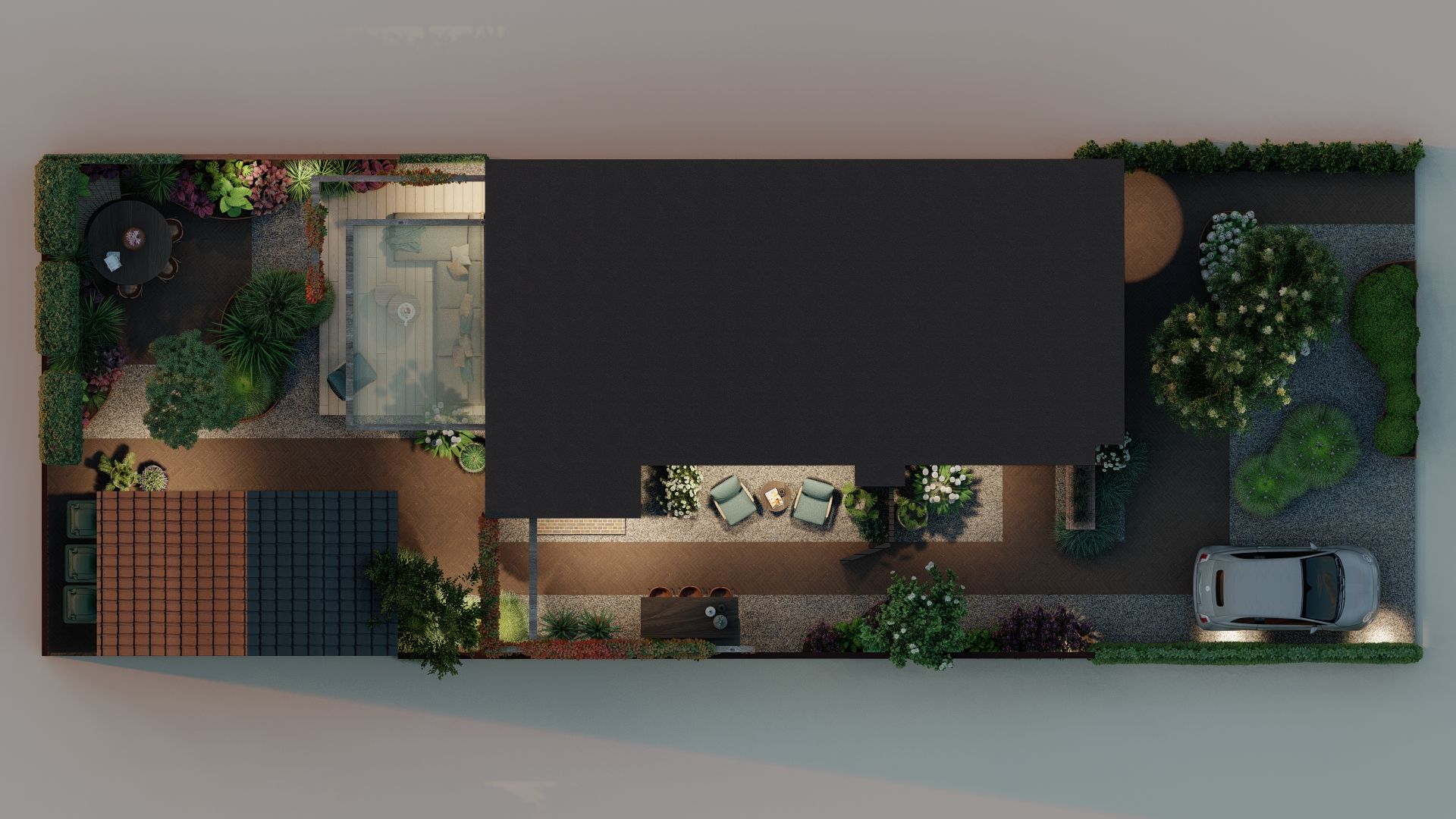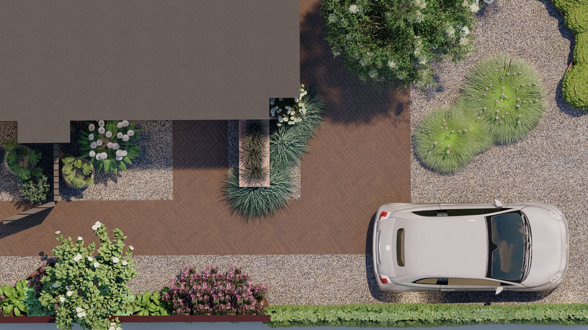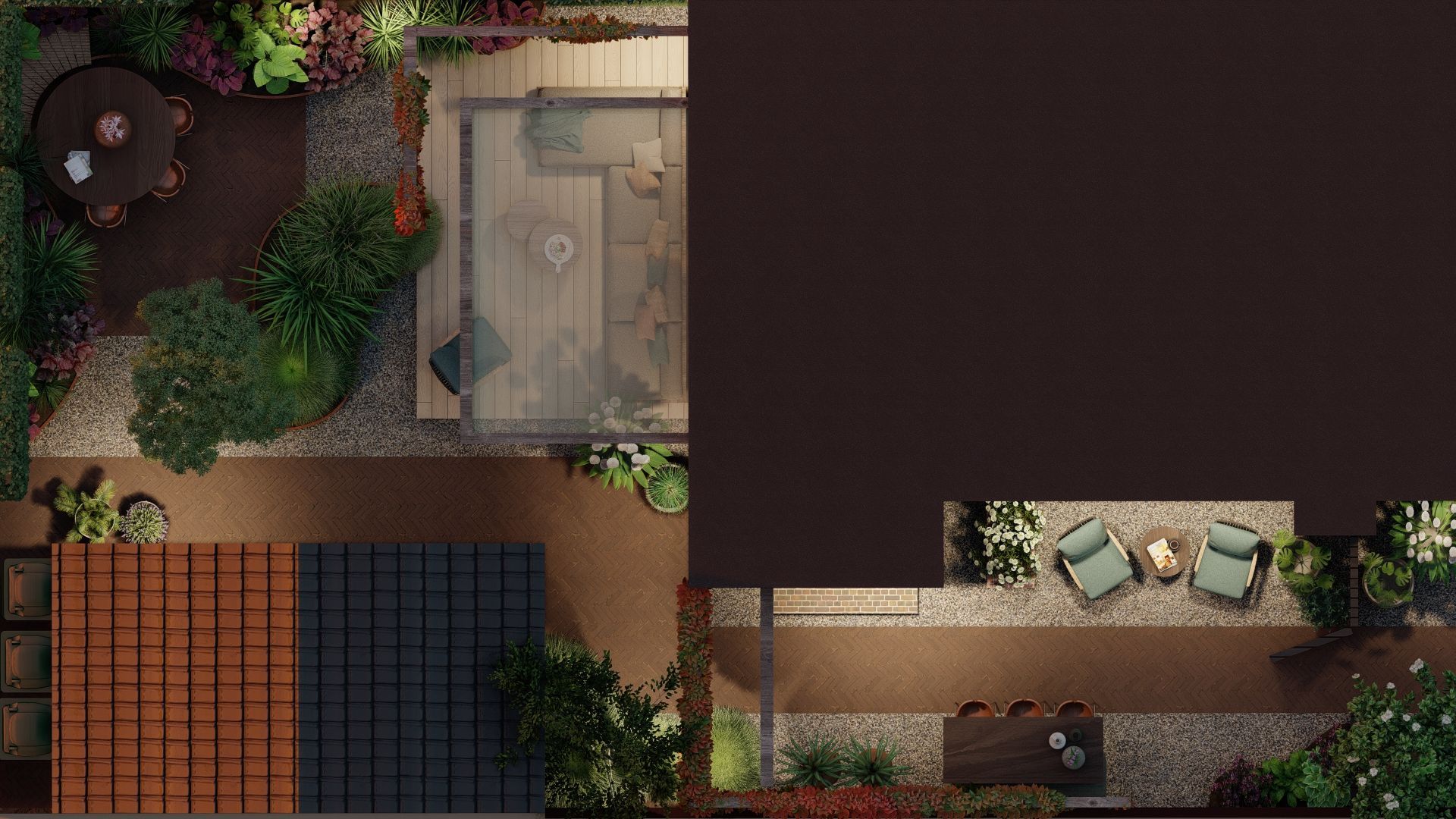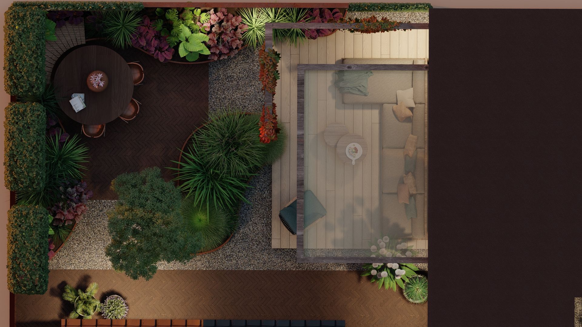 Een dertige jaren woning vraagt een om tuin die naadloos aansluit bij de stijl van het huis. In dit ontwerp is gekozen voor rechte lijnen voor de verharding, afgewisseld met organische vormen voor de verhoogde plantvakken van CortenStaal. De rood-bruine waaltjes passen perfect bij de kleur van het huis. De combinatie met het grind en de lichte houten vlonder brengt de juiste balans in deze tuin. Onder de pergola met zonnedoek kan ook op de hele warme dagen genoten worden van verkoelende schaduw. De Leibomen achterin de tuin zorgen dat de tuin heerlijk uit het zicht gehaald wordt van tegenoverliggende woningen. Aan de zijkant is genoeg ruimte voor een heerlijk zitje in de ochtendzon. En met de pergola voor de schuur komt het geheel prachtig samen!