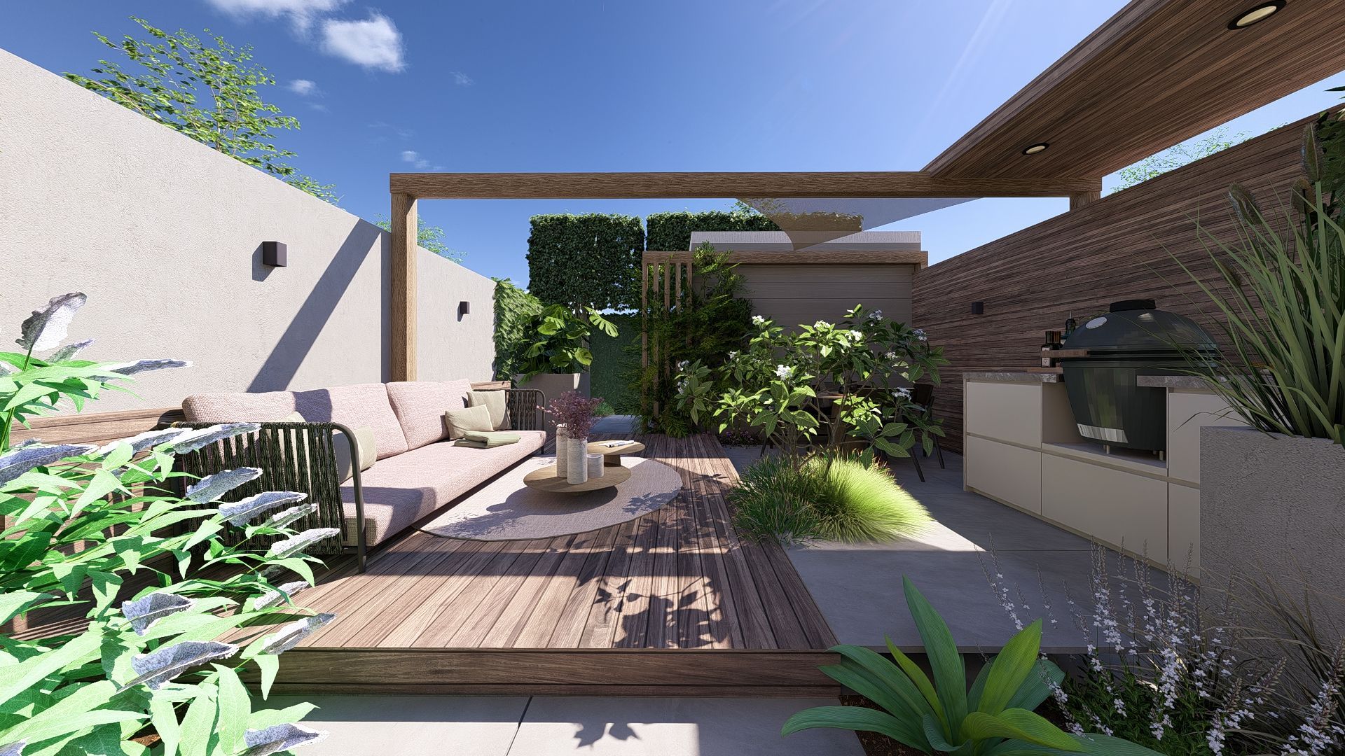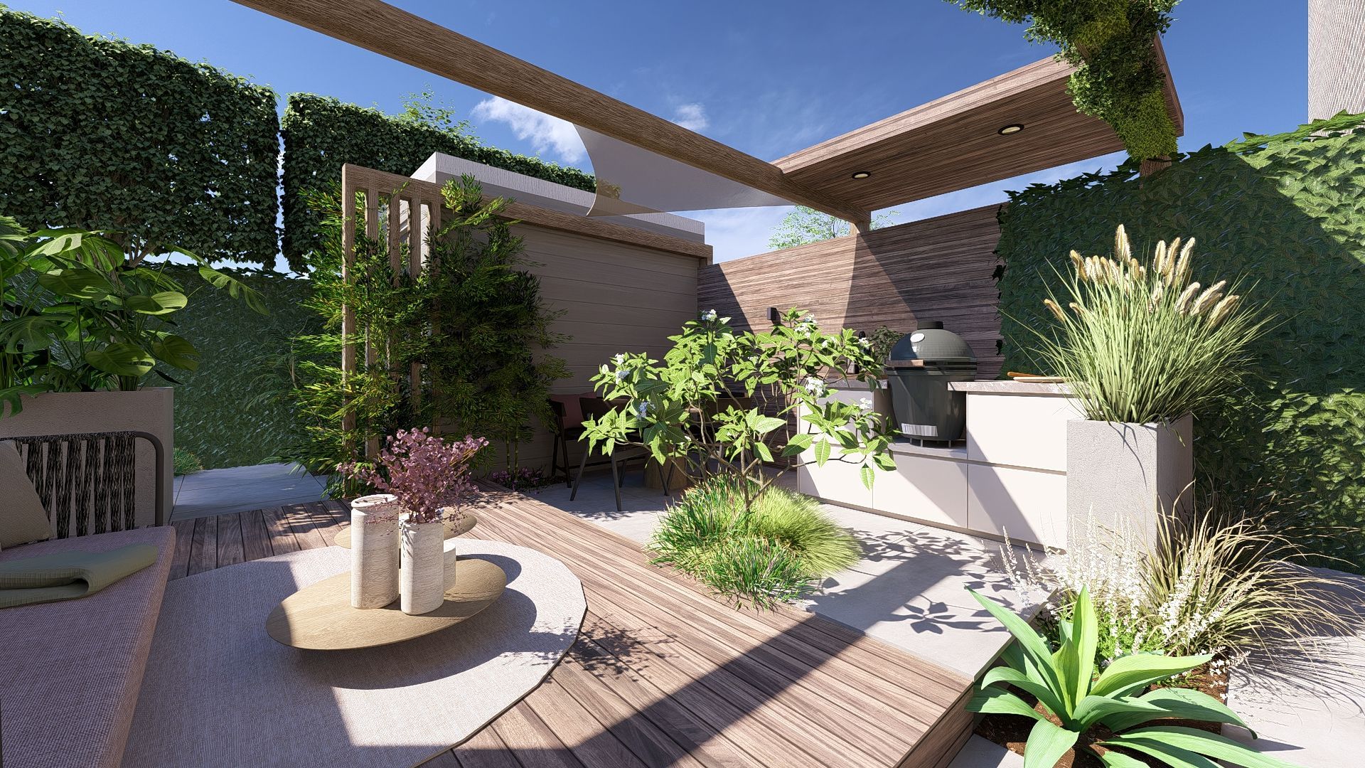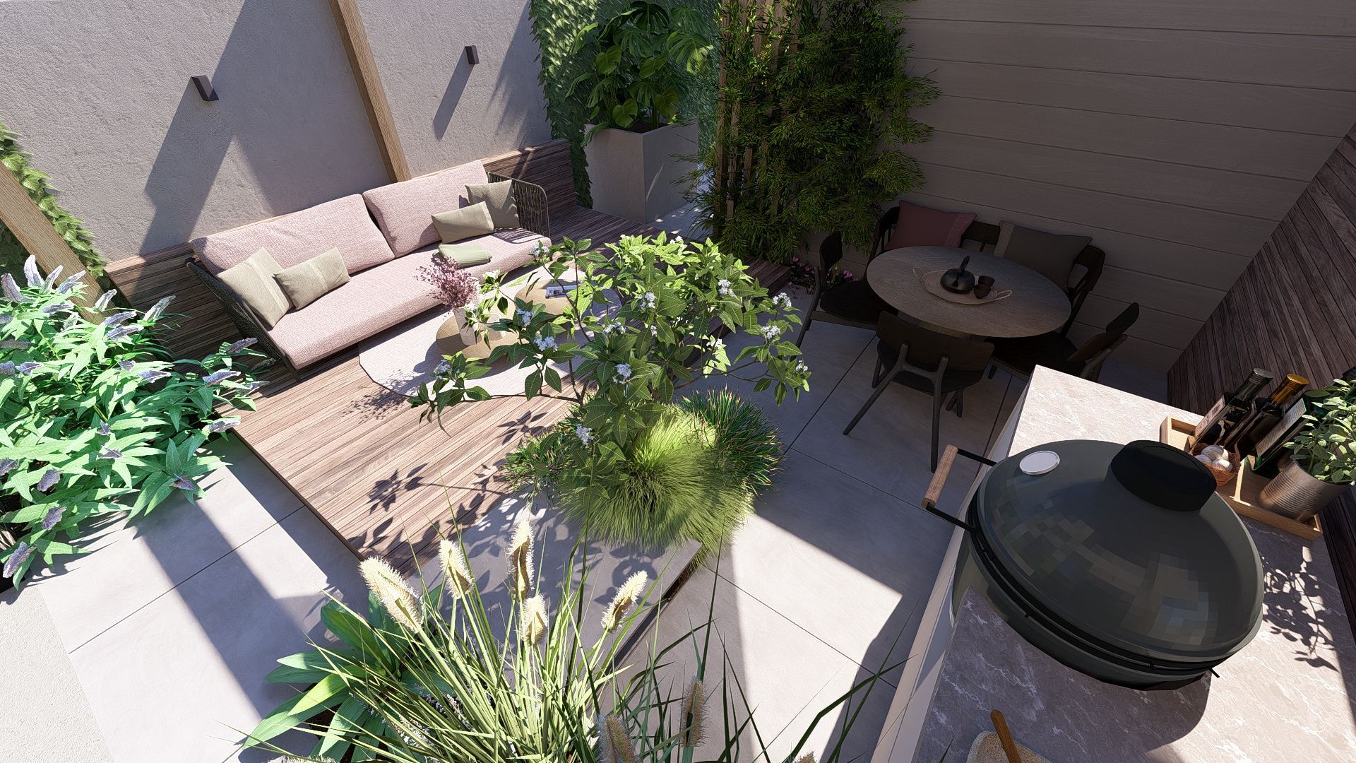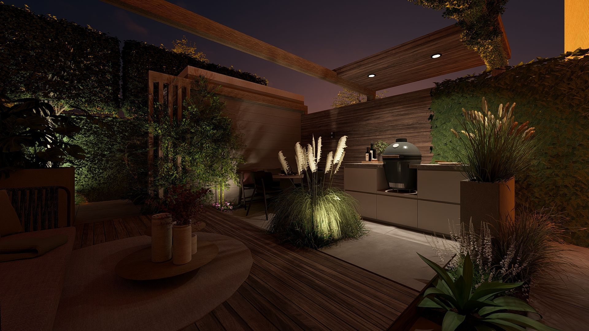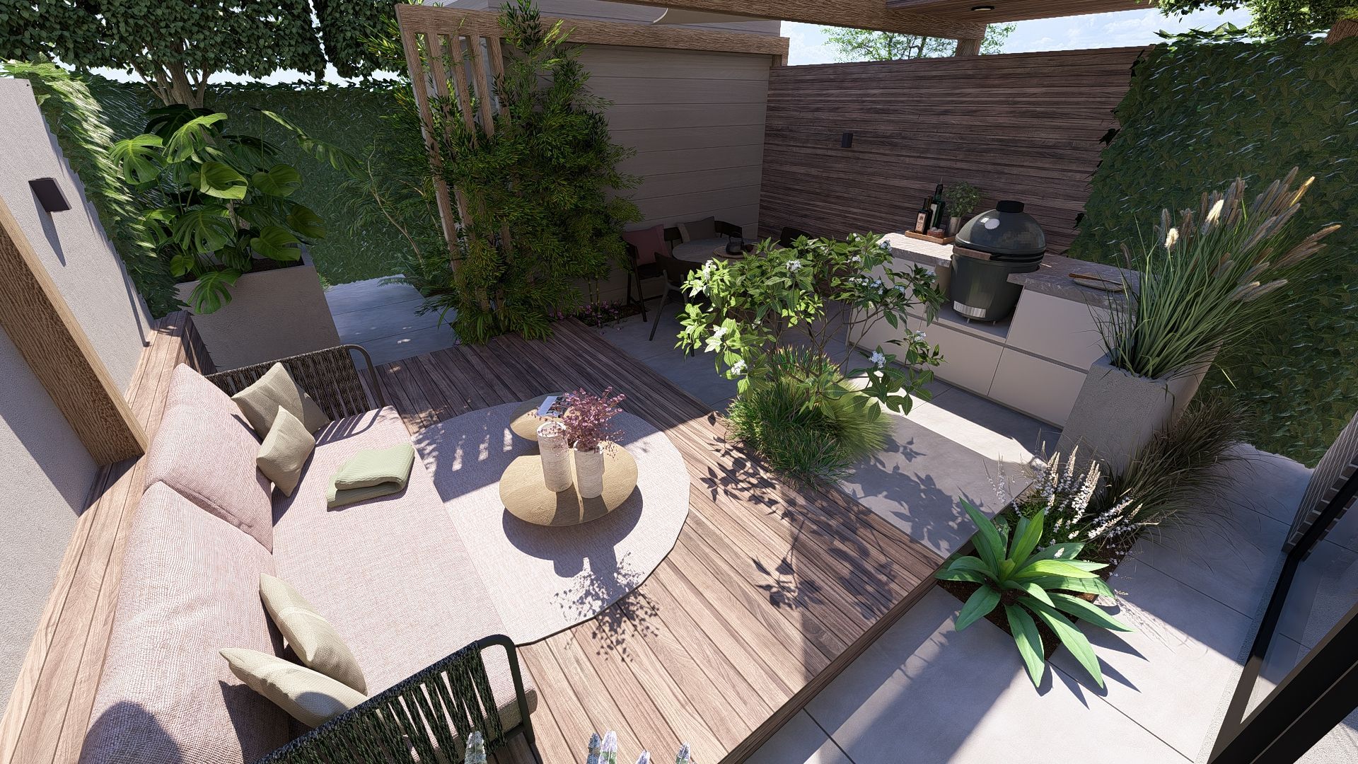 Een heel klein tuintje waar heel groots genoten kan worden, dat was de wens. Want naast loungen moest er ook ruimte zijn om samen te kunnen eten en genieten van een heerlijke bbq maaltijd. En dan het liefst wel een bbq met een luxe jasje, zoals een buitenkeuken van Cooxs. Prachtige zandkleurige keramische tegels met een schutting en afdak van Padouk hout. Een hardhout soort dat werkelijk waar prachtig vergrijsd. Door Leibomen op de juiste plek te plaatsen ontstaat er een mooi groen aangezicht vanuit huis. Bijkomend voordeel is dat er meteen meer privacy ontstaat hierdoor. Geniet mee van deze kleine tuin vol verrassingen. Aangelegd door Schaffelaar hoveniers.