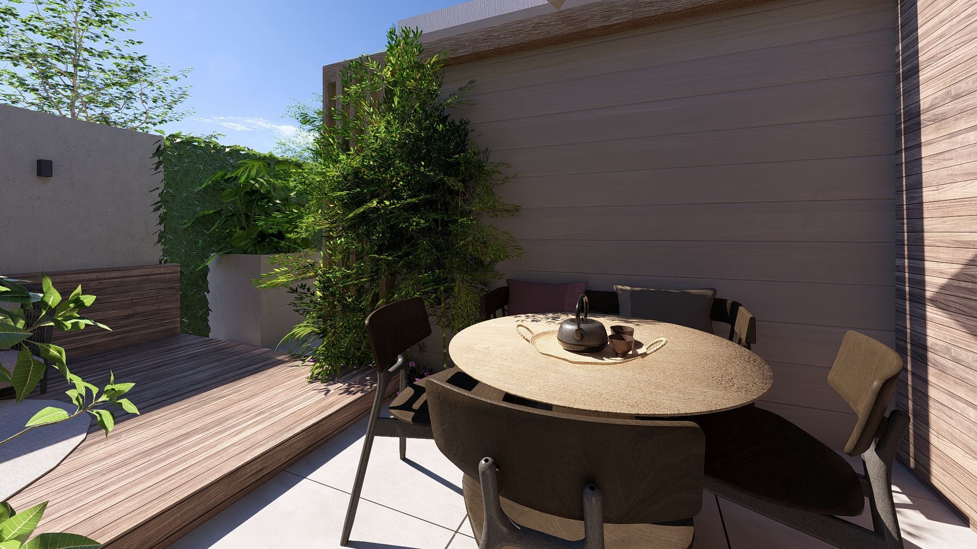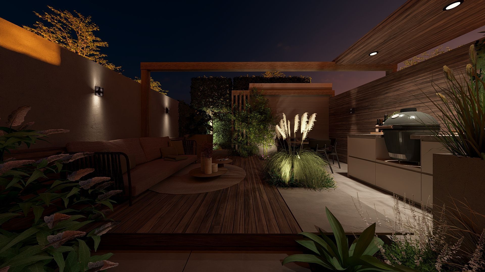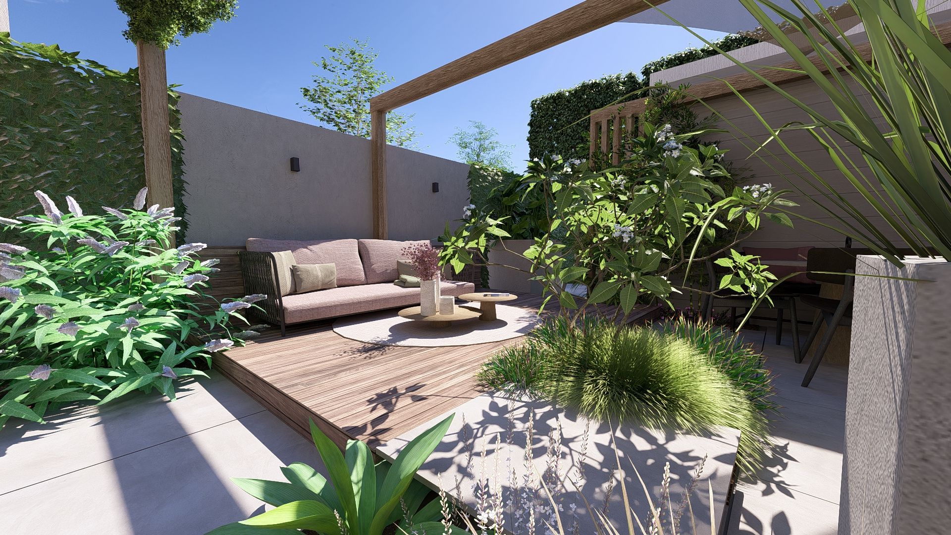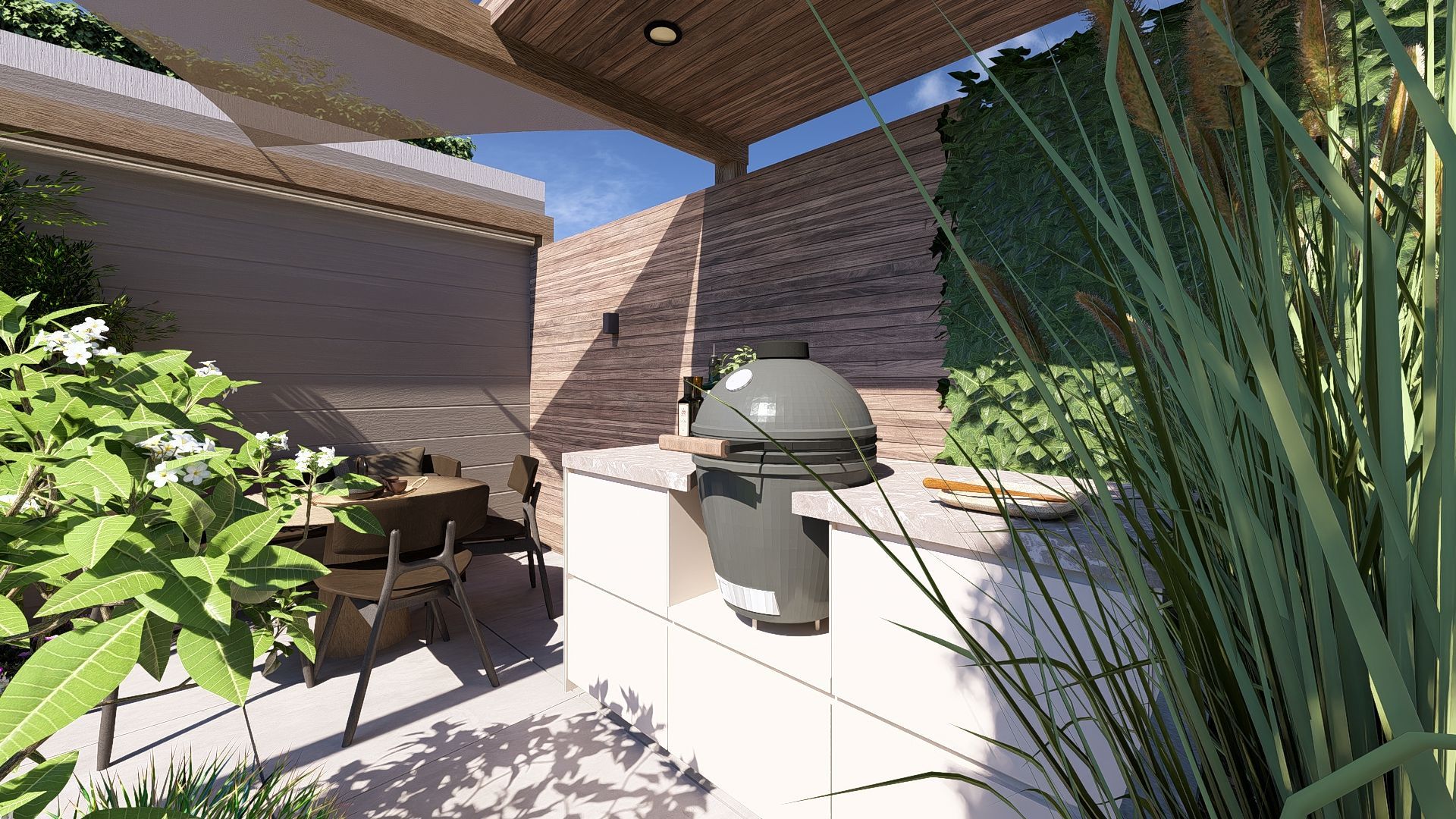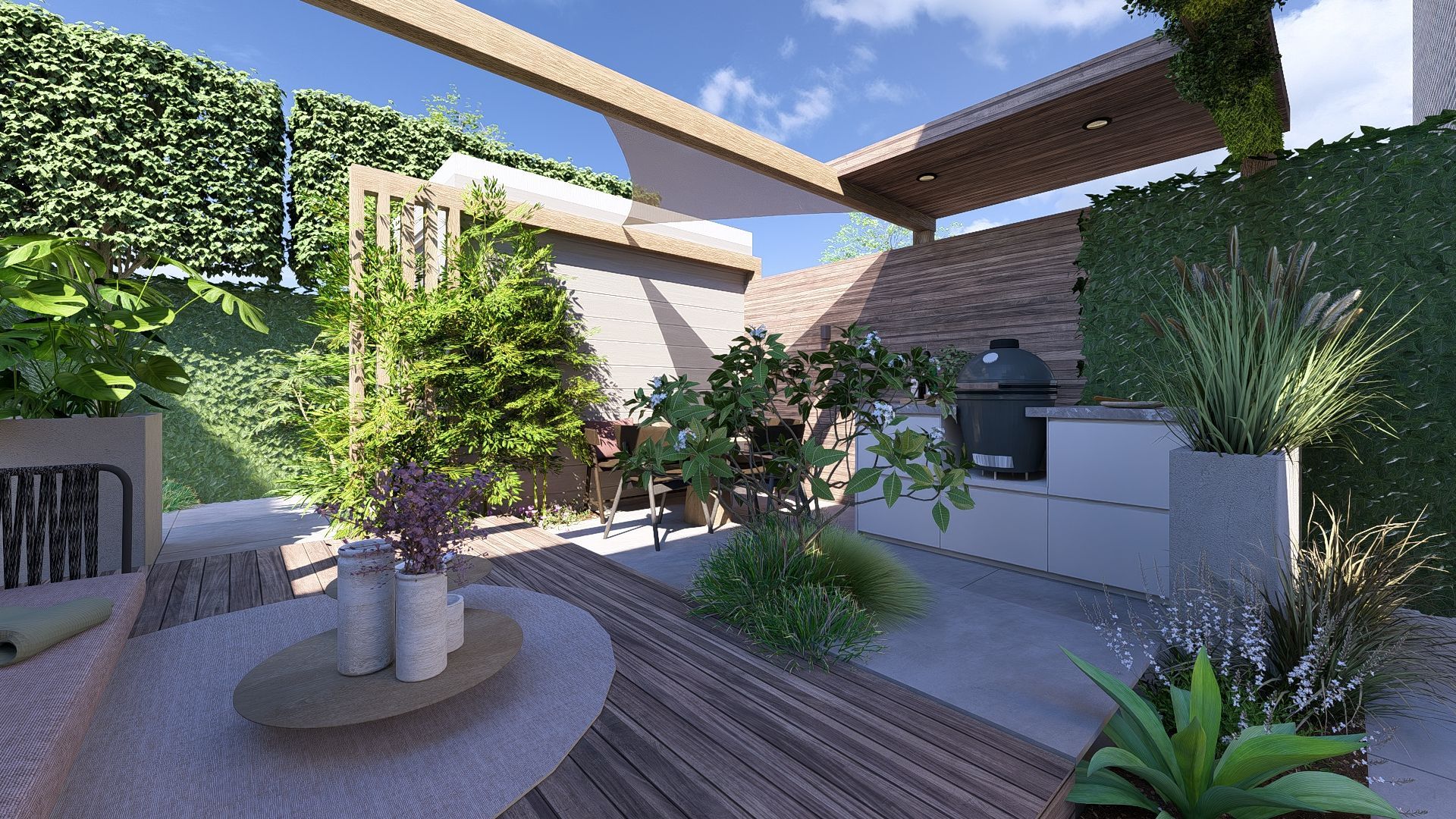 Een heel klein tuintje waar heel groots genoten kan worden, dat was de wens. Want naast loungen moest er ook ruimte zijn om samen te kunnen eten en genieten van een heerlijke bbq maaltijd. En dan het liefst wel een bbq met een luxe jasje, zoals een buitenkeuken van Cooxs. Prachtige zandkleurige keramische tegels met een schutting en afdak van Padouk hout. Een hardhout soort dat werkelijk waar prachtig vergrijsd. Door Leibomen op de juiste plek te plaatsen ontstaat er een mooi groen aangezicht vanuit huis. Bijkomend voordeel is dat er meteen meer privacy ontstaat hierdoor. Geniet mee van deze kleine tuin vol verrassingen. Aangelegd door Schaffelaar hoveniers.